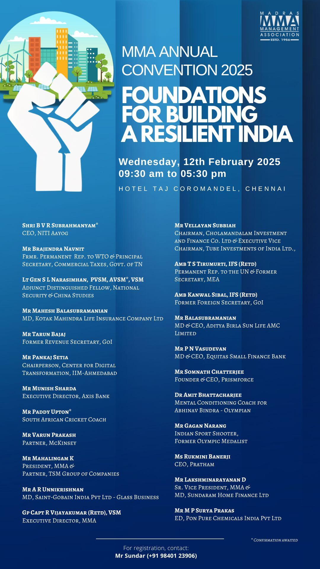 The MMA Annual Convention on “Foundations for Building a Resilient India,” scheduled to be held on Wednesday, 12th February 2025, at Hotel Taj Coromandel, Chennai, promises to be an insightful event. It will delve into strategies for strengthening India's resilience across critical dimensions, enabling the nation to leapfrog into the future. The convention will also offer practical insights to help businesses remain agile and resilient amidst evolving challenges.