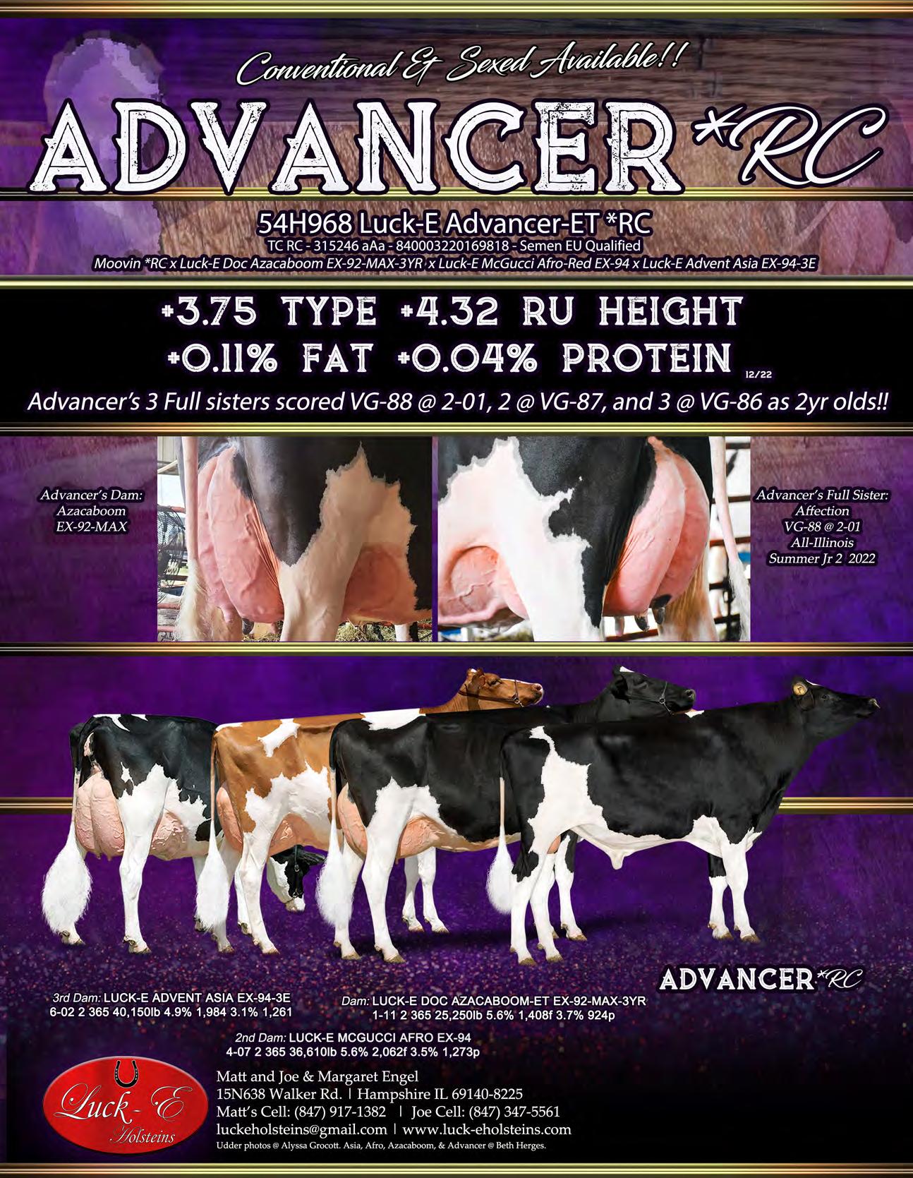 Luck-E Avlnch Klassy-Red-ET EX-94 2nd Dam of Lot 141 LUCK-E AWESOME-RED 72186769 100%RHA-NA CV TC TY TL TD PTA +2.01T +2.81UDC +0.72FLC GTPI +1449G Absolute x Luck-E Advent Asia-ET EX-94-2E LUCK-E DELTALAMBA KALLIE 840003204072703 3-03 EXCELLENT-91 EEEVE 1-11 2 319 24040 3.8 916 3.0 712 3-00 2 292 27220 4.5 1237 3.2 871 1st Jr 3 & Best Udder, IL State Show 2022 1st Jr 2 & Best Udder, IL State Show 2021 Int & Res Grand Champion, IL State Jr Show 2021 2nd Dam: Luck-E Avlnch Klassy-Red-ET EX-94 2-00 2 365 21470 4.3 918 3.4 724 4-00 2 361 34610 4.2 1446 3.4 1181 Member Reserve All-American Produce 2022 1st Jr 2, Midwest Spring R&W Show 2019 2nd Jr 2, Midwest Spring Holstein Show 2019 Luck-E Advent Kandie-Red-ET EX-95-2E 3-09 2 365 31400 4.9 1540 3.5 1114 5-04 2 365 40340 4.7 1877 3.4 1378 Unanimous All-American 5yr Old 2014 Red & White Cow of the Year 2014 Senior Champion, Best