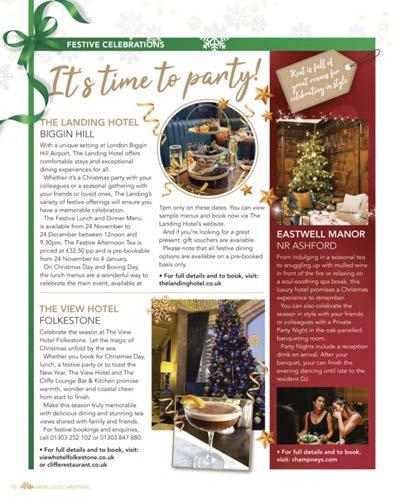 Every year, MMM Media is delighted to bring you a very special gift, our glittering guide to the festive season – believed to be the only one of its kind in Kent. We really know what makes this county tick and this is an indispensable guide to Christmas, enabling your products, services and establishments to be seen by the most discerning shoppers and clientele. The publication features seasonal fashion, jewellery, recipes, gift ideas, pantos, parties, special events, grottos, decorations, TV listings and more. To really evoke the seasonal spirit, the pages are scented with cinnamon so it even smells like Christmas, whilst the front cover features a sparkling glitter finish. This beautiful publication promises pure luxury and is sure to fire your festive imagination.