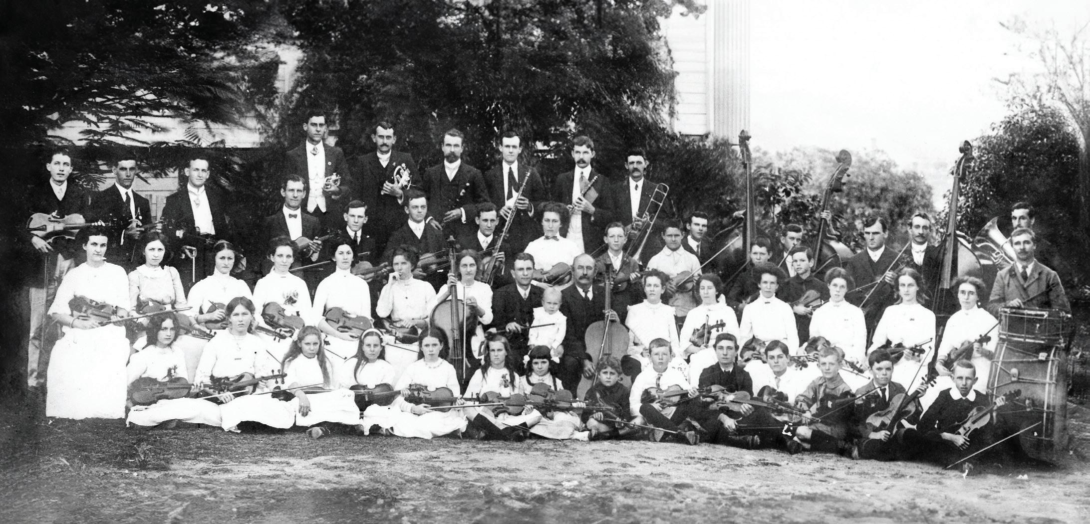 Second front row (l-r): Mrs C. Baker (violin), M. Glazebrook (violin), D. M. Moylan (violin), L. Lee (violin), N. Cairncross (violin), A. A. McCarthy (violin), S. Young (cello), A. J. Baker (conductor), A. W. J. Baker (infant), J. H. Nash (cello), T. M. Ruddell (violin), H. McConnell (violin), D. Lisle (violin), M. E. Whiteley (violin), H. Young (violin), Mrs F. S. Sanderson (violin), W. E. Whitehead (drums).