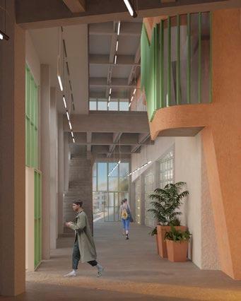 An interior street serves various activities across two levels, connected by a double-height space. Additionally, common areas and technical rooms for the dwellings are included, ensuring a cohesive and accessible environment.