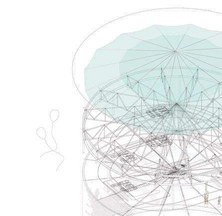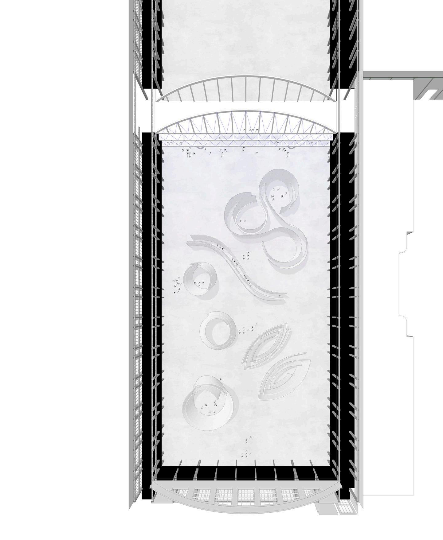 of the walls that creates concave-convex geometries picks up the wind and redirect it to propellers. A gigand hammock becomes the ceiling, allowing people to fly and and see a fantastic view of the horizon.