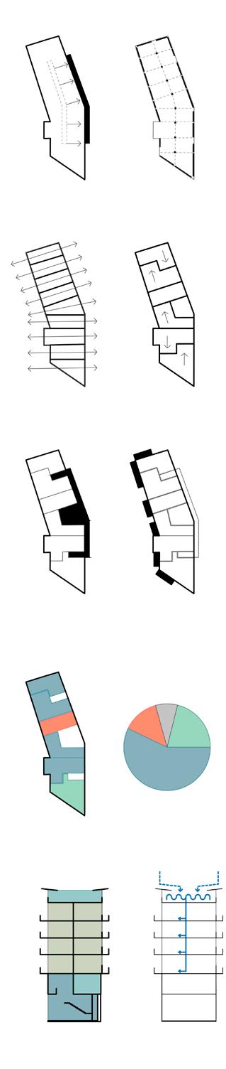01. The circulations are brought to the facade to free up all the interior space and dedicate it to the dwellings.