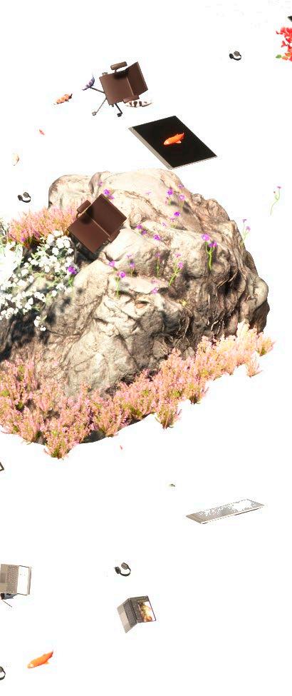 Es un jardín que no tiene flores, sino auriculares, teléfonos y pladur.