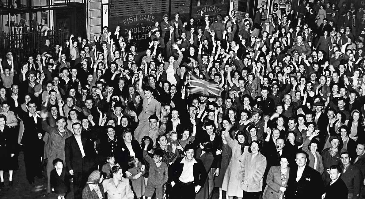 Photo taken at 1am outside the American Red Cross Club, wherejubilant Shrewsbury crowds lit a fire in thestreettomark Victory overJapan Day in 1945.