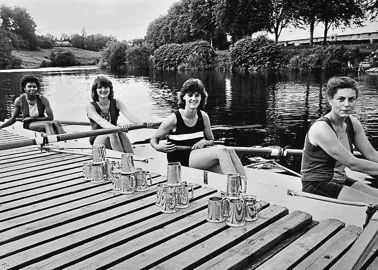 Pengwern Boat Club’sWomen Senior Acomposite coxed four joined the elite. With their fifthwin of theseason they achieved Elite status, the highest class in rowing. Coached by former competitiveoarsman Paul Nutley, the four areseenheredisplayingsome of their trophies, from left,Audrey Wedderburn, Karen Hughes, Gill Morris (Ironbridge Rowing Club) and JoyBowesonthe River Severn in 1987.