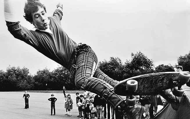 Skateboarder Mervyn Thomas,14, of Springfield, gives an impromptu demonstration of his skills at Shrewsbury SkateboardParkin 1980.