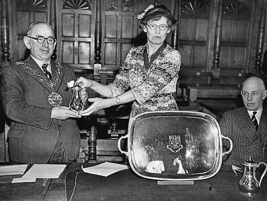 Aplate from HMAS Shropshirewas presented to Shrewsbury Corporation in 1954. Lady Wakeman, president of the ShropshireSociety in London, makes the presentation to Alderman Ellis-Jones, mayor of Shrewsbury. Also pictured is Major-General LordBridgeman.