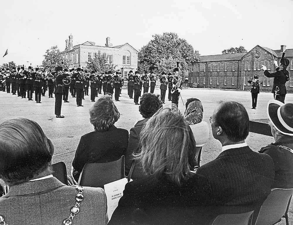 Guests were entertained when the Band and Bugles of the Light Infantry School of Music with the Band of the 3rd Battalion Light Infantry sounded retreat at Sir John MooreBarracks, Shrewsbury, in 1982.