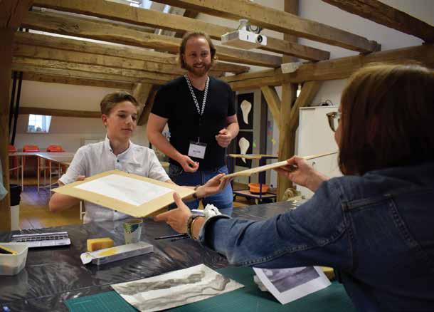 Nach einer Führung durch die Ausstellung erhielten die Teilnehmenden, zurück im Atelier, eine technische Einweisung in die Materie. Es wurden die verschiedenen Grautöne, jegliche Feinheiten des Papiers sowie Unterschiede bei Pinseln und Farbpigmenten erläutert. „Wichtig ist, gutes Material zu benutzen“, sagte Julien, „auf die Qualität kommt es an.“ Er erklärte, welche verschiedenen Papier- und Farbsorten geeignet sind, und was es sonst noch zu beachten gilt, damit ein Aquarellbild gut wirkt.