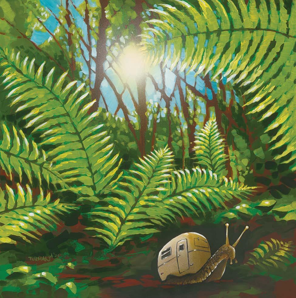It’s funny sometimes, how some things just come together. I didn’t know either of these facts before I came up with the concept and started painting a snail with a trailer as its shell making its way through a forest with ferns.