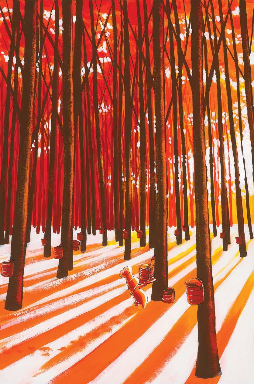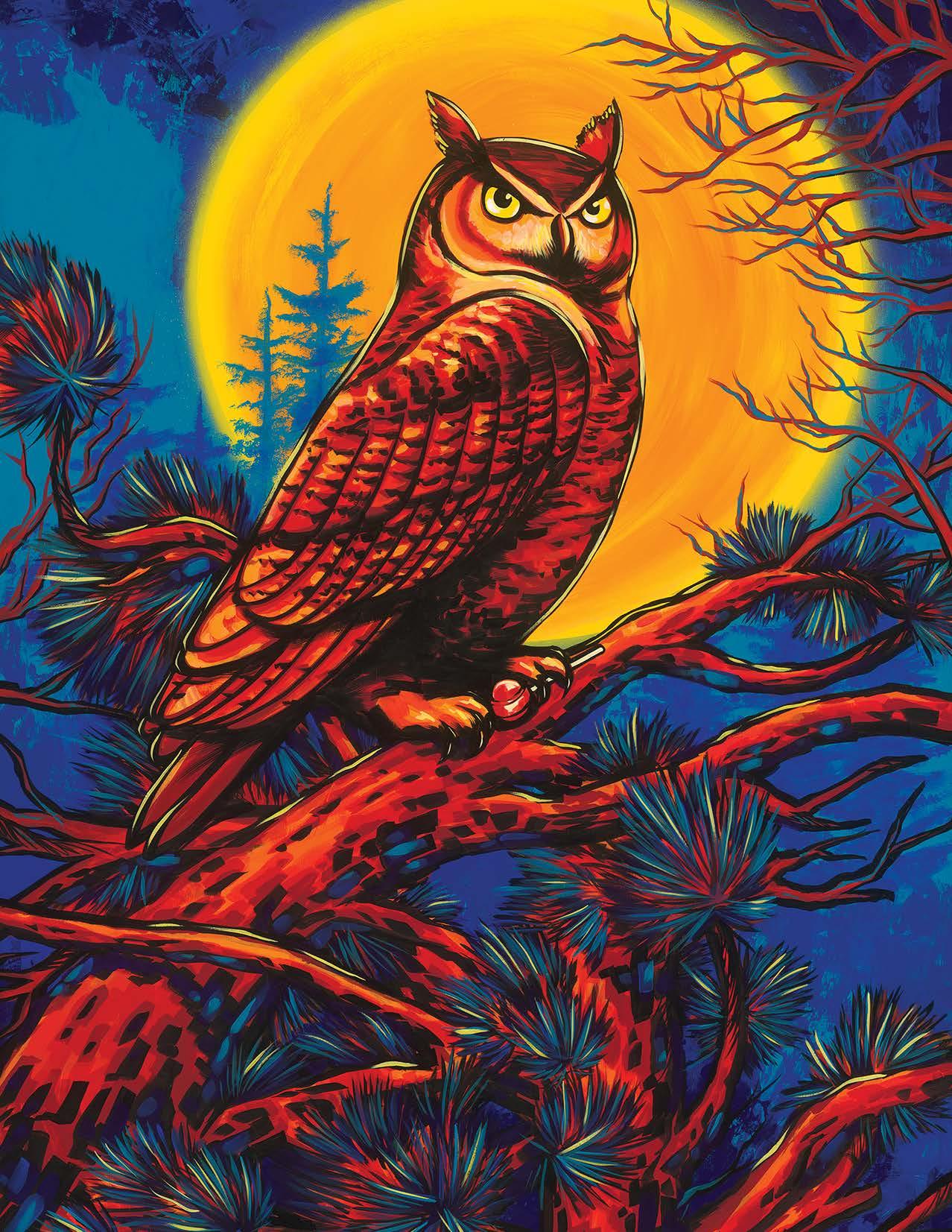 A family of great horned owls, affectionately referred to as “The Hoots,” has moved into a nest on my driveway. Often at night, one of the owls will sit high atop a Norway pine, a perfect silhouette with ear tufts/ horns. It was an amazing inspiration that just had to become a painting.