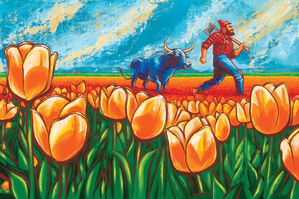 Here, I’ve painted the tulip fields from my childhood memory and invited a very famous Minnesota resident and his companion, on a dare — to tread as lightly as possible through the tulips.