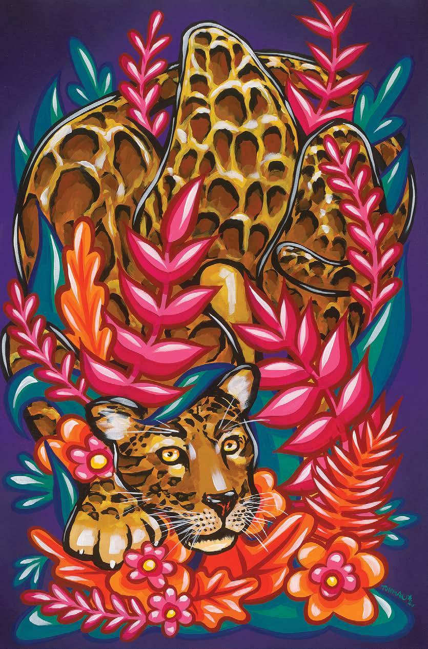 After some research, I found that the clouded leopard has a very unique pattern on its coat that looks surprisingly similar to a morel mushroom. Who knew? I took that big cat’s coat and wove it into the concept for this painting, adding dimension to the hunt of these rare creatures.