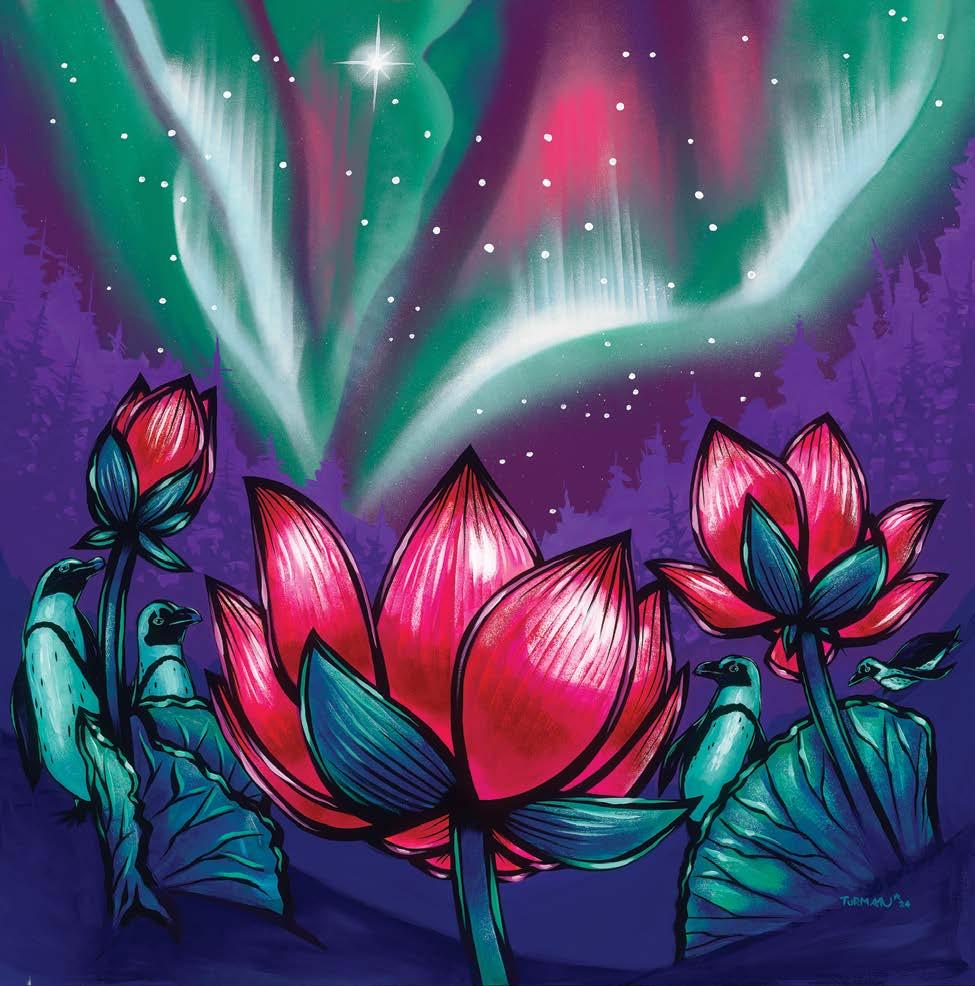 To me, the lotus and the twinkling lights look like stars in the night sky, and the colors are similar to the Northern Lights. I imagine the Northern Lights glowing down on the lotuses and of course, penguin friends would be hanging around checking out the sights.