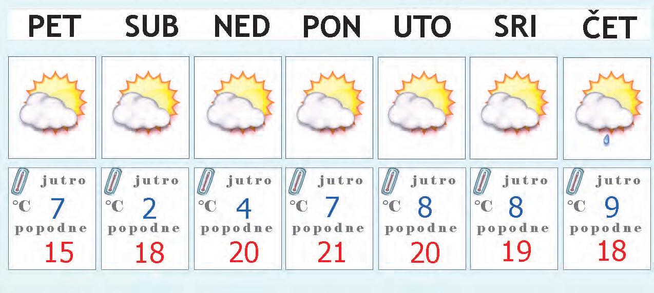 Jutarnja temperatura bit će od 6 do 8 °C (ili dopisati broj koji nedostaje), a najviša dnevna oko 15 Celzijevih stupnjeva.