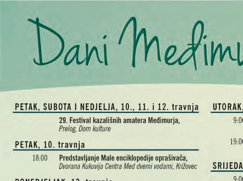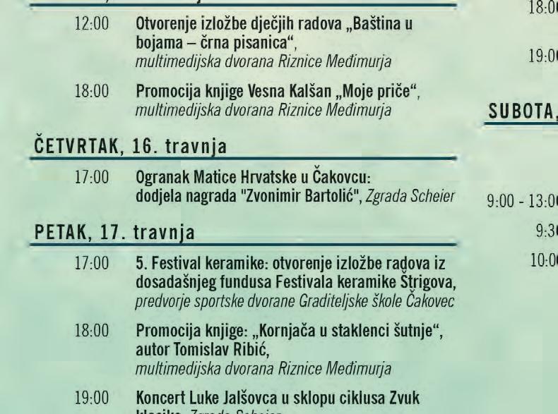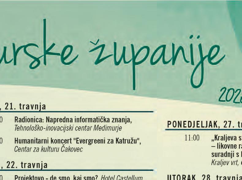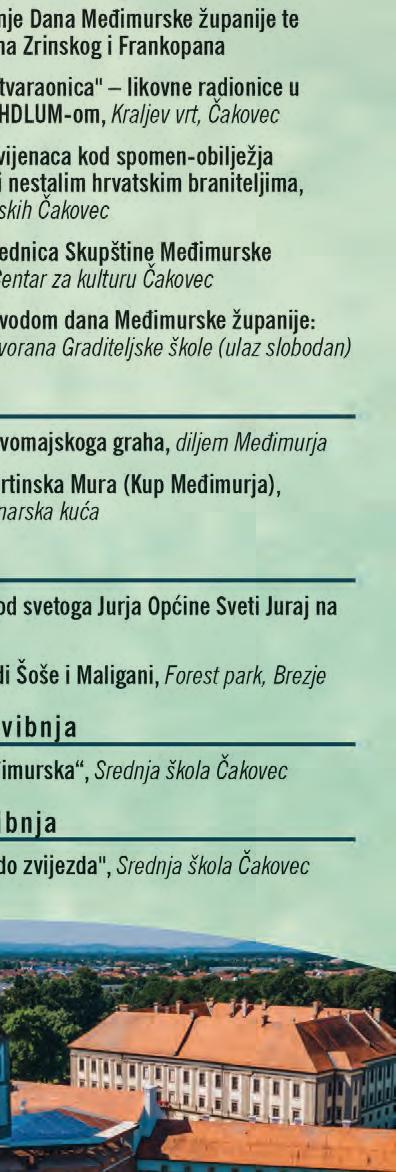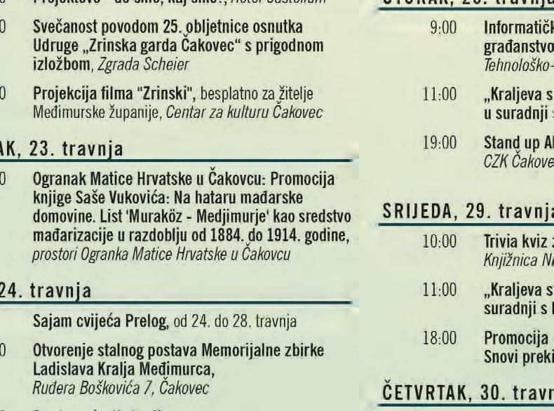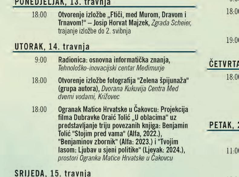 Program Muzeja Međimurja Čakovec tijekom mjesec dana programa donosi niz atraktivnih događanja. Među ostalim čeka nas otvorenje Memorijalne zbirke Ladislava Kralja Međimurca 24. travnja. Novi stalni postav posvećen jednom od najznačajnijih međimurskih umjetnika i dodatno obogaćuje kulturnu ponudu grada. Slijedi Dan otvorenih vrata Muzeja (25. travnja) uz besplatan ulaz u sve stalne i izložbene postave, uz dodatne sadržaje poput izložbe oldtimer vozila. Manifestacija „Mali školski kustosi“ (15. svibnja) potiče najmlađe na istraživanje baštine i razvijanje kreativnosti kroz ulogu kustosa. Uz te, čeka nas još niz raznih programa u sklopu obilježavanja Dana Međimurske županije. Muzej Međimurja Čakovec poziva sve posjetitelje da postanu dio ove priče, kroz kulturu, povijest i jedinstvene doživljaje koji oživljavaju baštinu našega kraja.