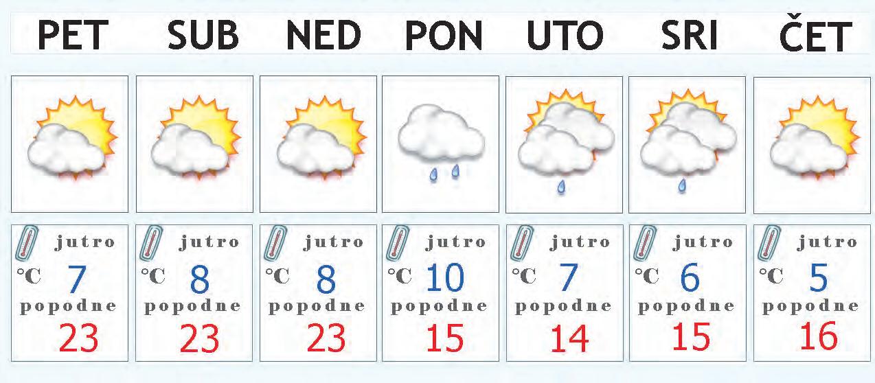 VREMENSKA PROGNOZA: Za petak prognoziramo djelomično sunčano i suho proljetno vrijeme. Nakon svježeg jutra s temperaturom od 6 do 10 °C, danju će nas sunce ugodno ugrijati, pa bi dnevni maksimum