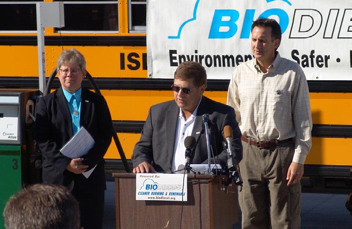 Then MSGA President Bob Worth (front) speaks alongside Gov. Tim Pawlenty during an event promoting Minnesota’s historic move to B2 on Sept. 29, 2005. This fall, Minnesota Soybean celebrates two decades of biodiesel leadership.