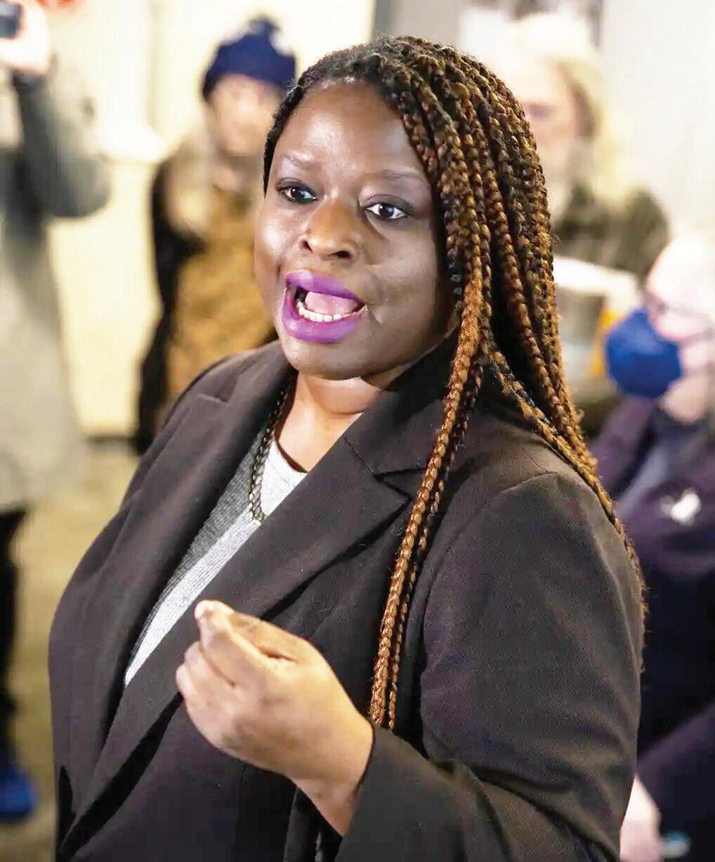 Civil rights attorney Nekima Levy Armstrong speaks to reporters as the Minneapolis City Council discusses a federal consent decree on Jan. 6, 2024. Armstrong was later arrested by federal agents following a protest at a St. Paul church. Ben Hovland/MPR News