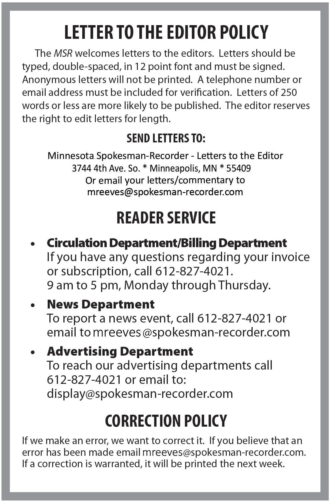 Please proof, respond with email comfirmation to ads@spokesman-recorder.com The MSR handles billing digitally. This means you will get e-tears and emailed invoices unless you specifically request a hard copy.