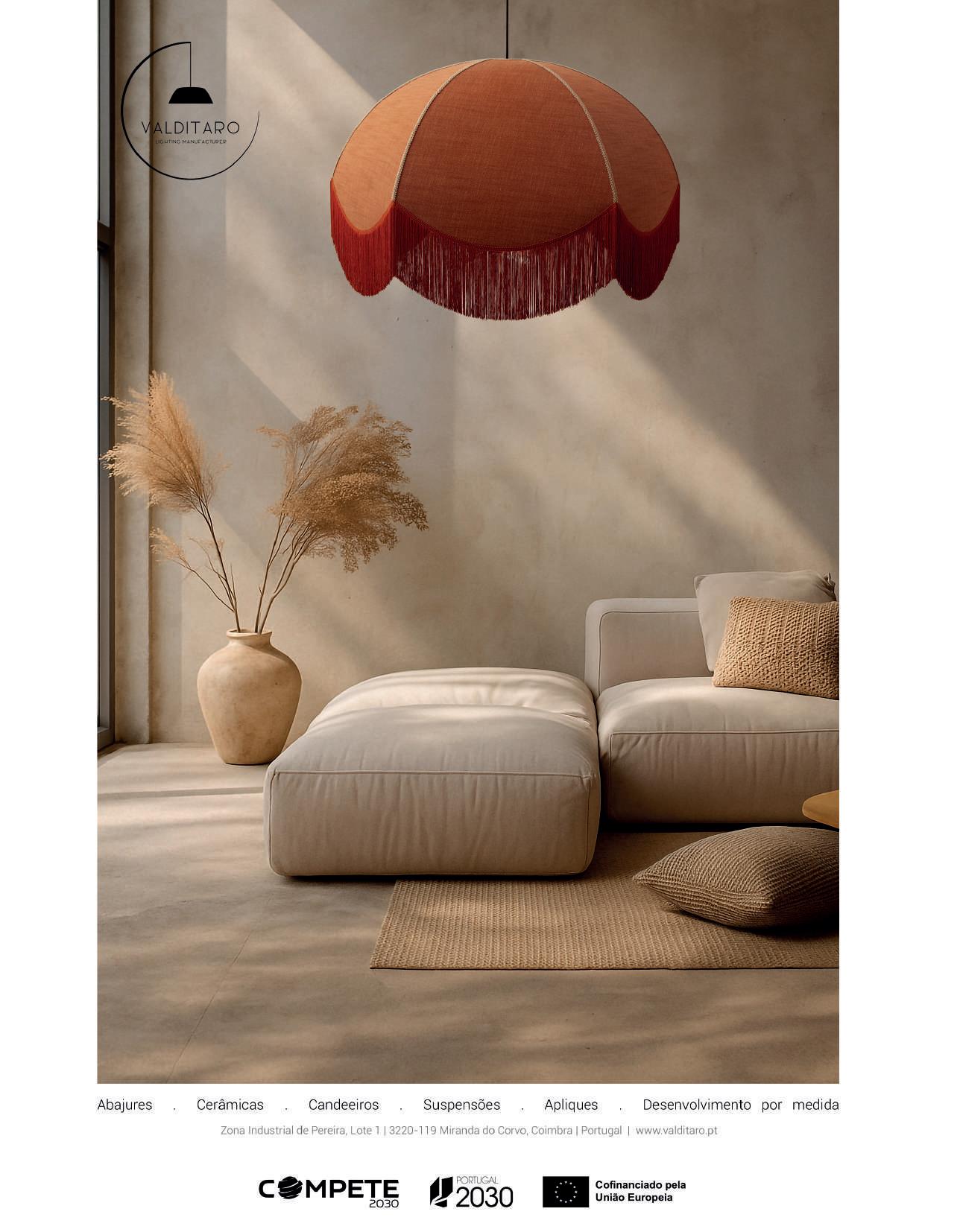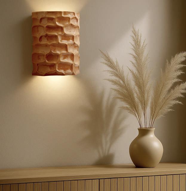 A sua base em cerâmica apresenta um acabamento vidrado em tom terracota, transmitindo calor e naturalidade. O abat-jour cria uma iluminação acolhedora que convida a tranquilidade e o bem-estar. É o toque final ideal para espaços de leitura, momentos de descanso ou decorações que privilegiam o artesanal e o conforto visual. A sua presença acrescenta personalidade e elegância a qualquer decoração.