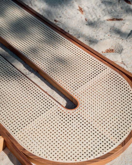 CHOUCHOU is a jacquard upholstery fabric with a geometric design composed of contiguous shapes, where each curved line seems like a gesture interrupted midway, as if the design was breathing at its own rhythm. The base has an effect like a Panama weave with a micro-reticulated where smooth arches rise, repeated with enormous visual precision. The pattern, formed by mirrored half-moons that intertwine like links in a serene chain, creates an undulating and organic movement. It is a special fabric that conveys harmony, continuity, and elegance, as if each curve invited the eye to follow a tranquil and endless path. This fabric is available in a palette of 7 varied colours, which gives it depth and texture.