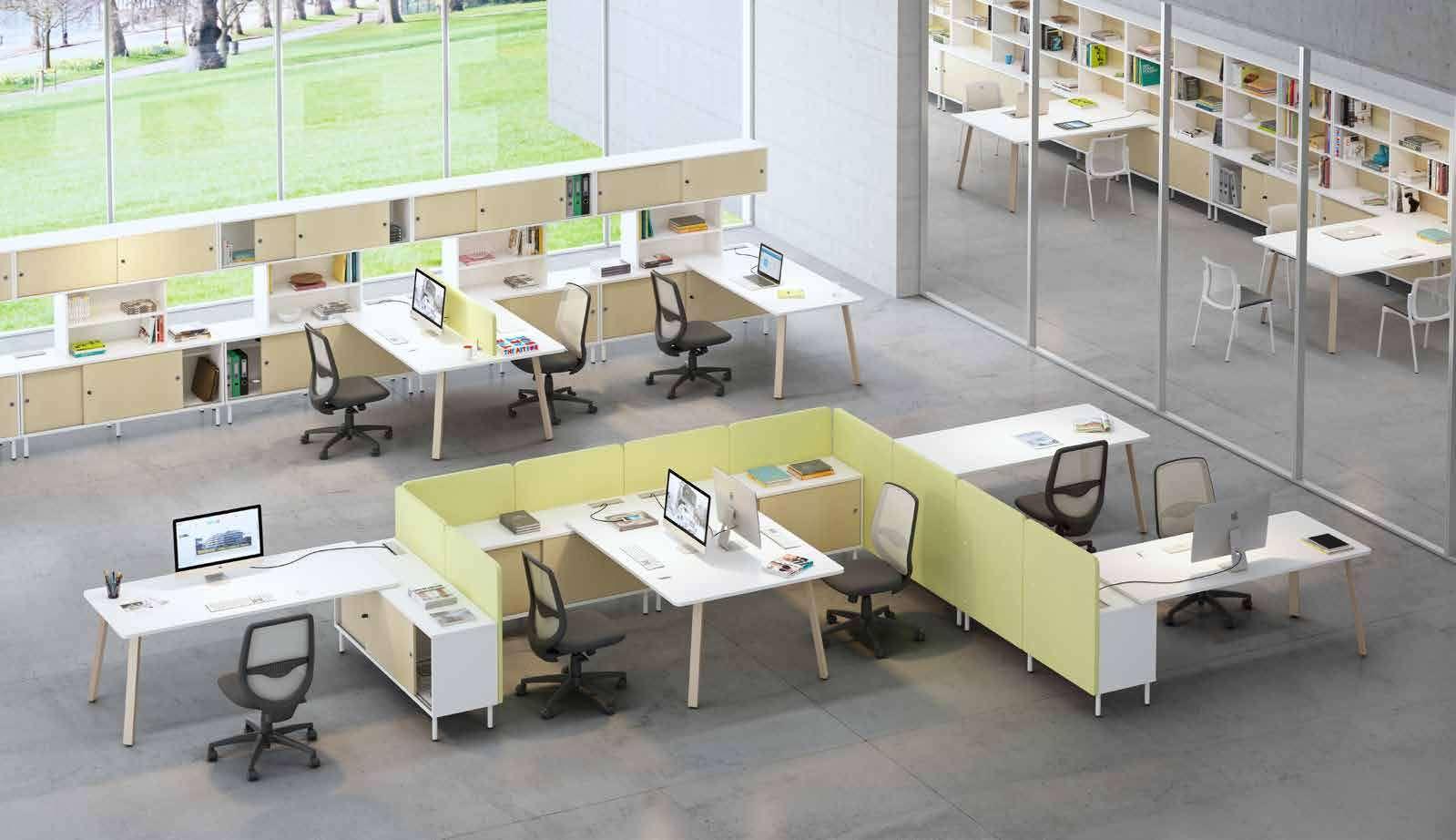 Su diversidad de formas y la particularidad del diseño de la pata, nos permite resolver el equipamiento para zonas de Dirección, puestos Operativos y Multipuesto, así como zonas de reunión, estas últimas totalmente integradas con puestos operativos.