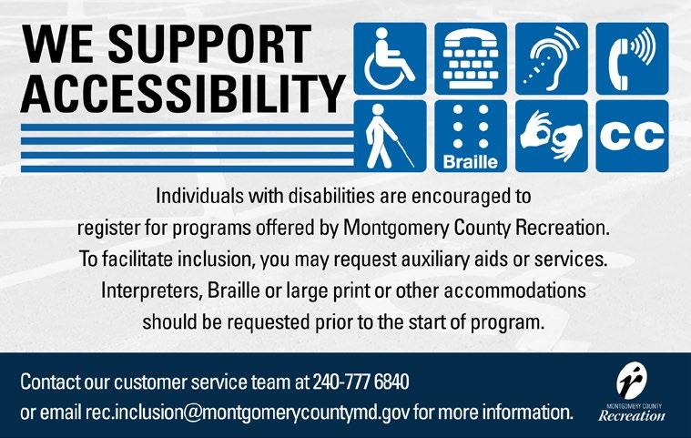 Please email rec.inclusion@ montgomerycountymd.gov, or speak to our Customer Service team at 240-777-6840.