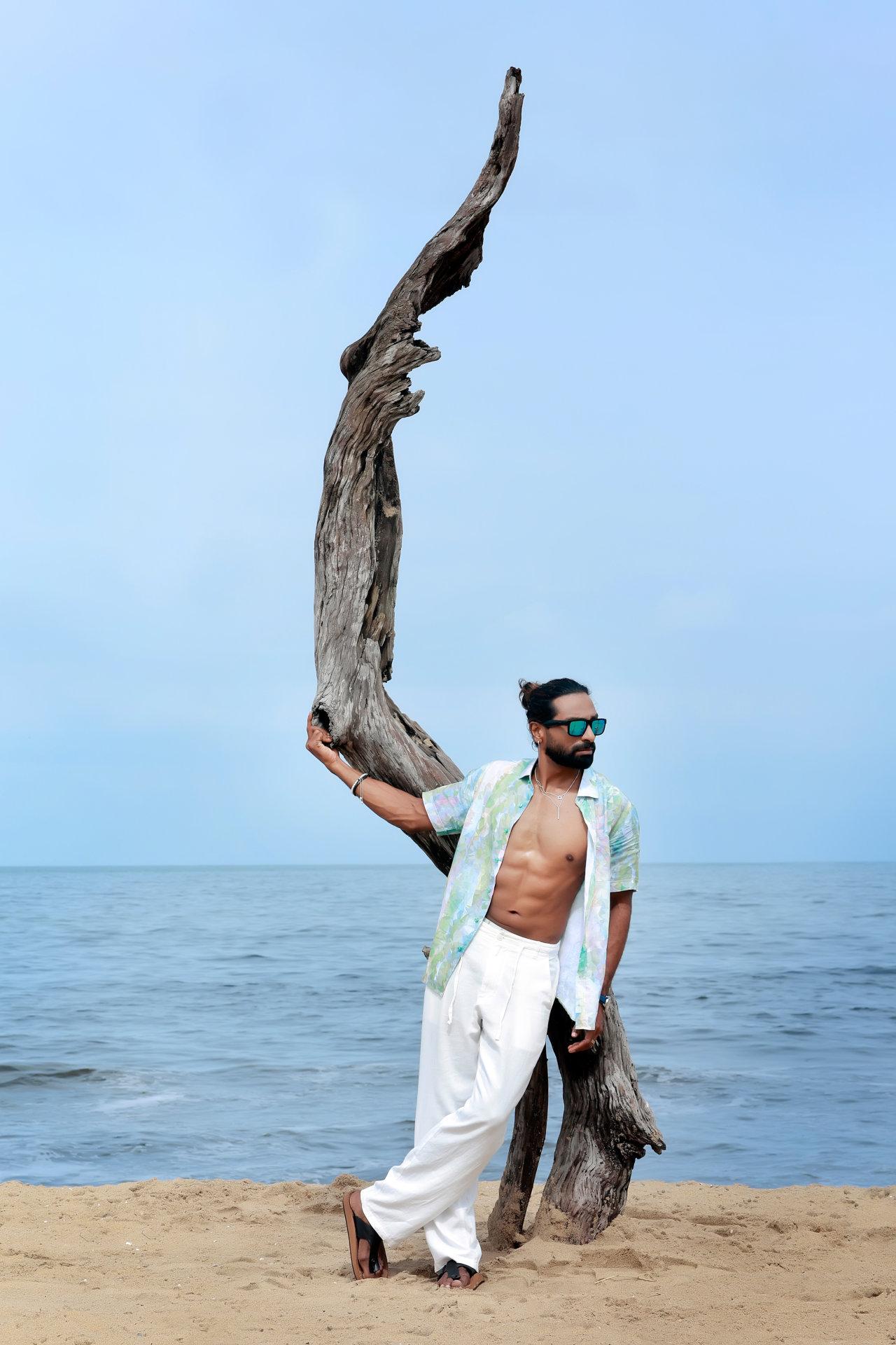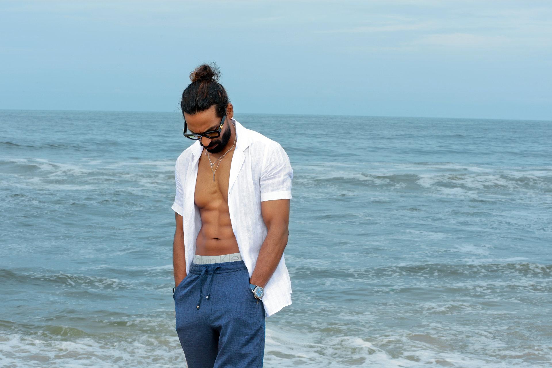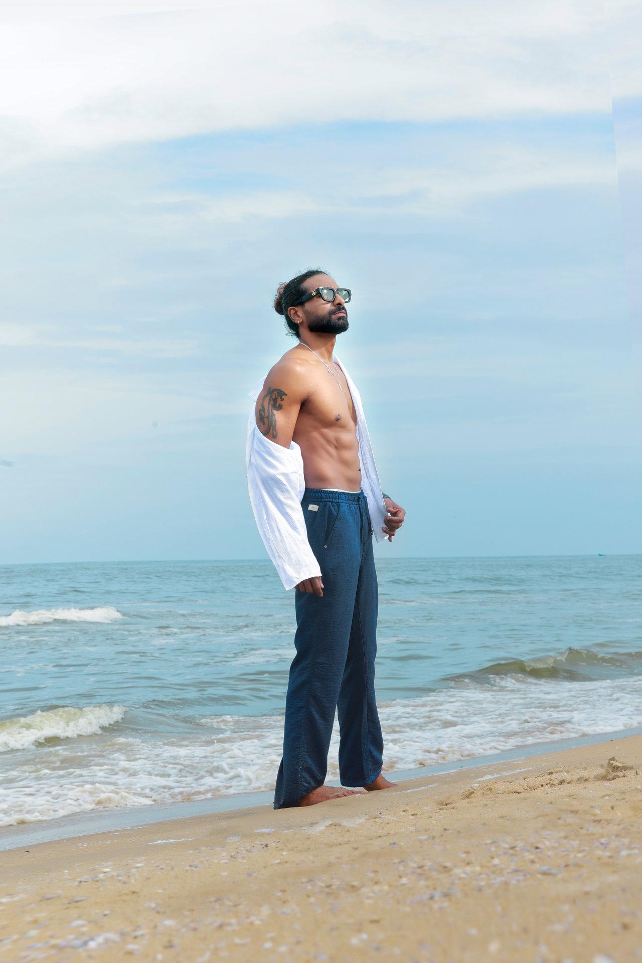 “Coastal Ease-Casual linen contours defined by ocean air and sun washed tones, balancing comfort with confident restraint, style that feels natural and relaxed by the shore.”