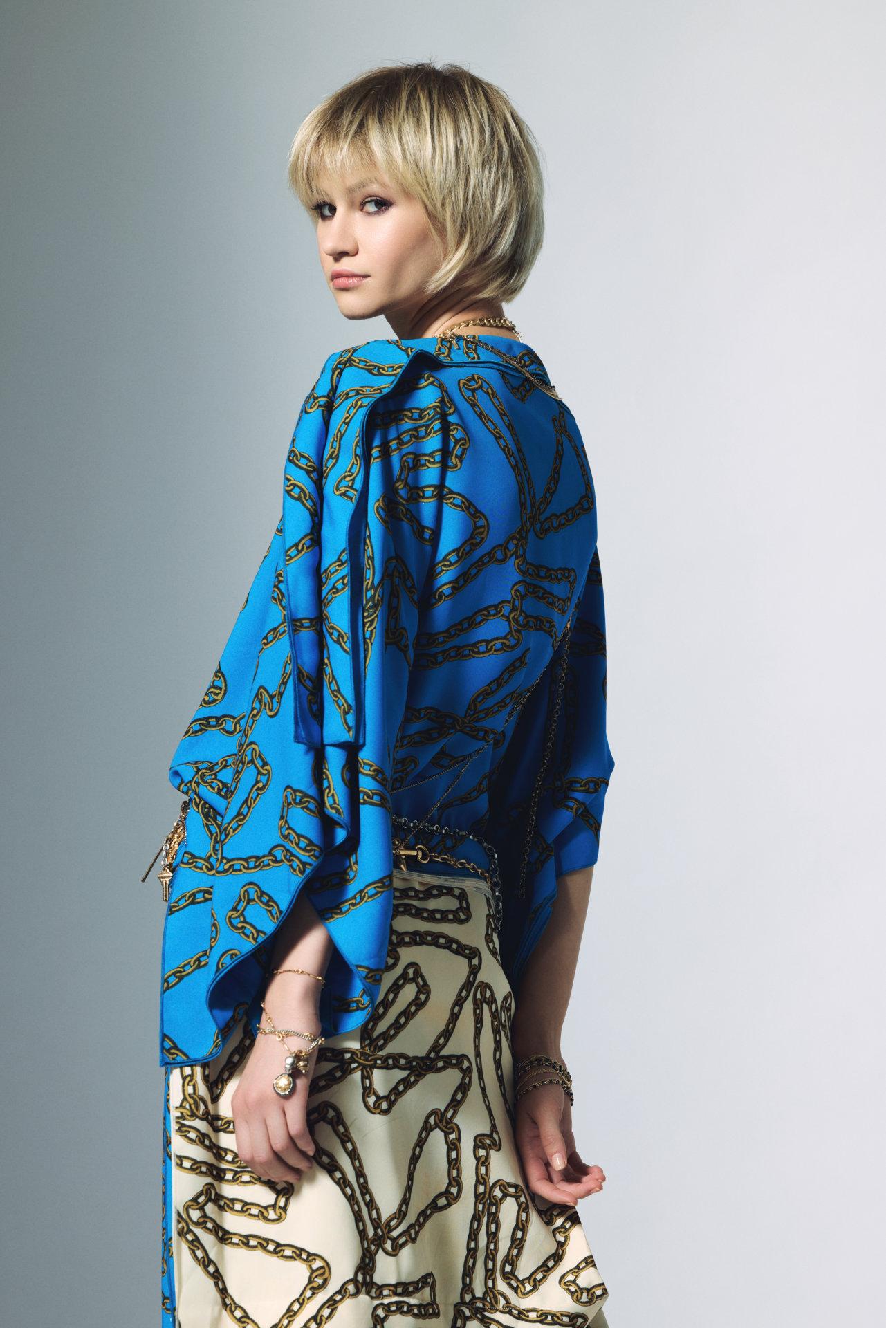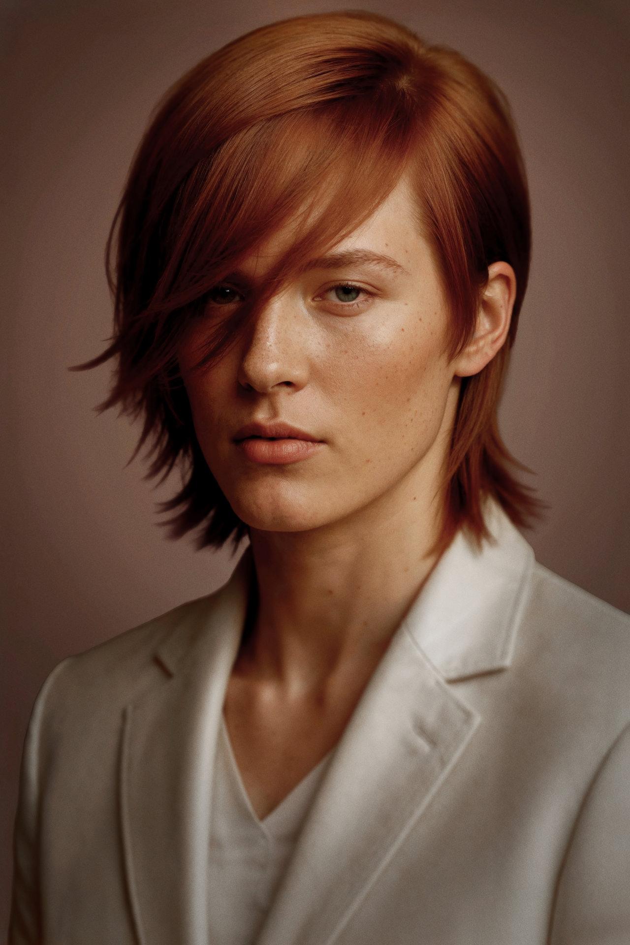 In cut part two modular universes: A structured short square, bursting with light thanks to Blondorplex toner. A short pixie with bangs, assertive and vibrant, intensified by Color Touch (vegan certified) for a deep and bright brown.