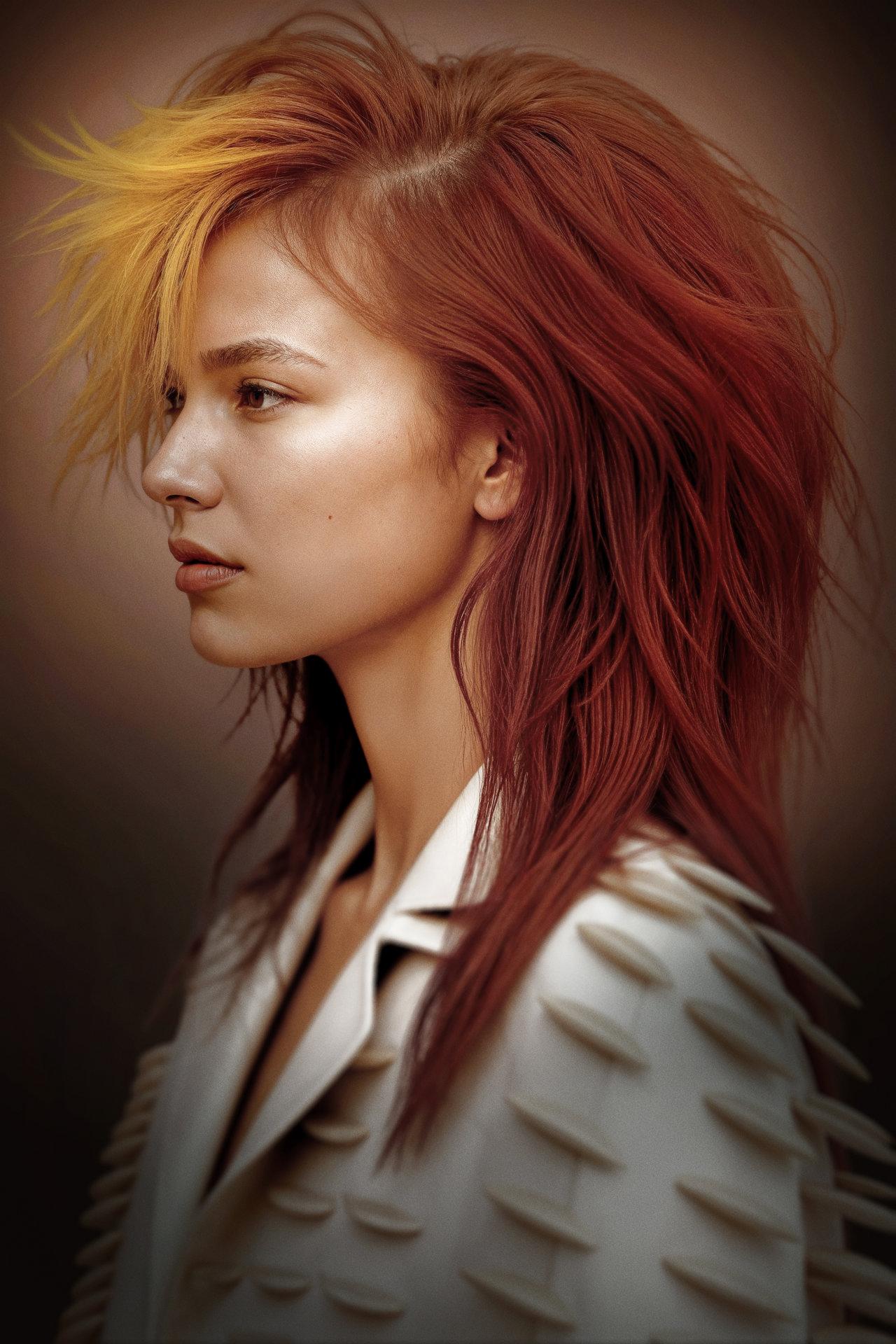 The chosen chromatic palette reinforces this narrative: intense reds, warm oranges, and golden gleams interweave with the depth of black, creating a contrast full of strength. Greenish highlights appear as an unexpected note, a subtle nod both to nature and to technological modernity, bringing a fresh and surprising nuance. Sonia Jiménez Cambronero’s proposal stands out not only for its bold use of color, but also for the technical precision it demands. Each stripe, each transition, each gradient has been crafted with meticulous care, turning hair into architecture. The result is not only aesthetic but also conceptual: it seeks to demonstrate that hair is not passive matter, but a living canvas capable of transmitting messages and emotions.