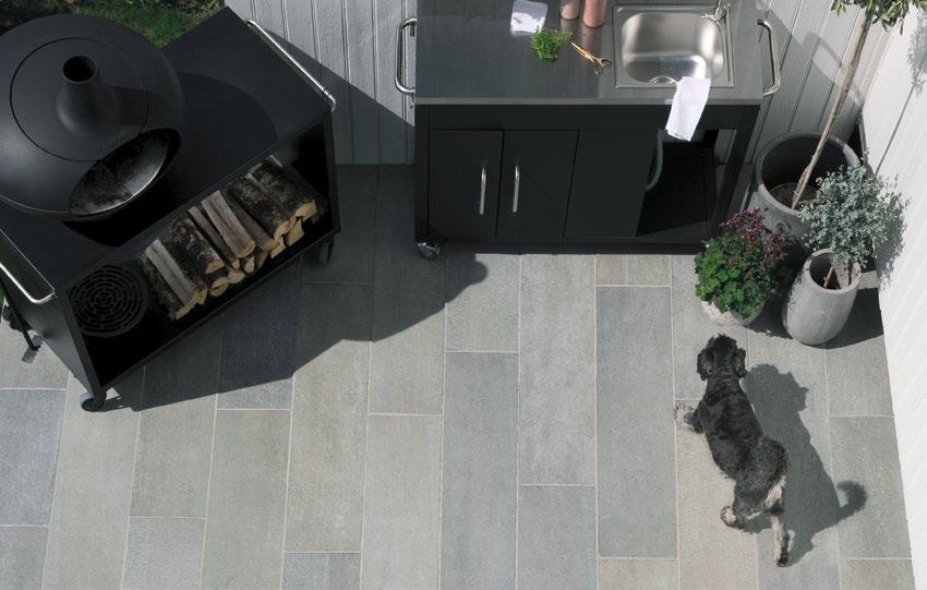 Firkantet grå skifer i tilfeldige størrelser. Et meget spennende konsept der man kan skape sitt eget uttrykk og design på uteplassen. Man kan blant annet oppnå en modulær tilnærming eller benytte som tråkkheller. Skiferen har et naturlig spill med varme farger, som gjør den godt egnet i kombinasjon med andre materialer.