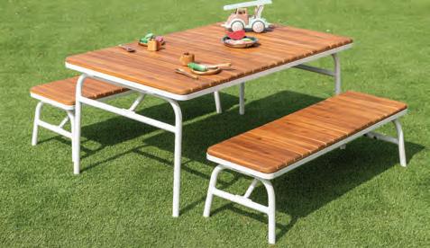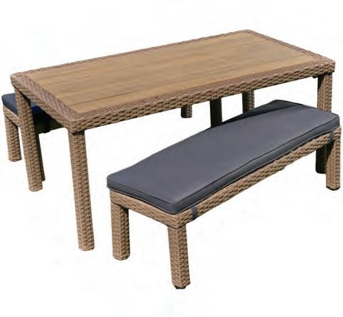 The Outdoor Wicker Table and Benches set is designed for early learning outdoor spaces. Featuring a solid acacia timber tabletop and two benches with natural-coloured plastic wicker, each bench is topped with a charcoal grey seat pad for comfort.