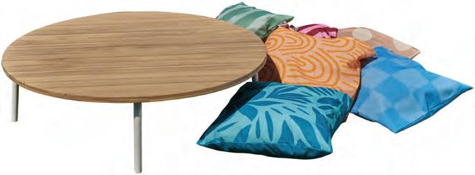 Inviting round low table with sturdy aluminium frame and acacia top, paired with 6 outdoor cushions in a mix of natural and vibrant patterns for flexible, social outdoor learning in early years. Table Size: 100 (dia.) x 30 (H) cm