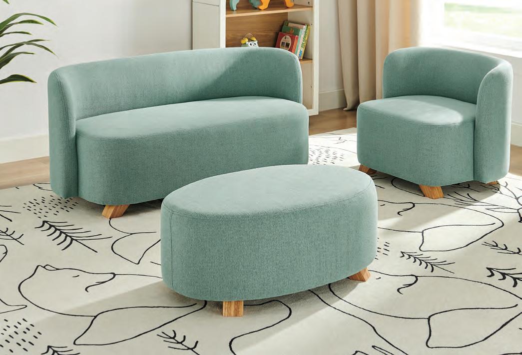 Curved and comfortable. The Aalto Curved Sofa set includes a single sofa, double sofa and ottoman in durable green fabric upholstery. Seat Height: 30 cm. ALT151GK