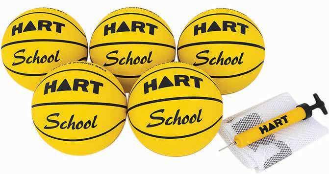 Kits include: 5x HART School Basketballs, 1x HART Carry Net and 1x HART Hand Pump. Contents and colours may vary.