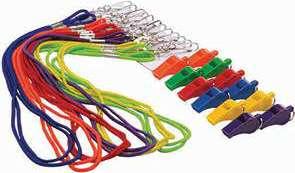 Moulded plastic whistles with natural cork pea. Can be attached to lanyards (sold separately).