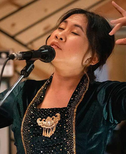 Peni Candra Rini is the daughter of a master puppeteer from East Java, Indonesia, and one of few female contemporary composers, songwriters, poets, and vocalists who performs sinden, a soloist-female style of gamelan singing. Strongly committed to preserving and sharing the musical traditions of her country, Candra Rini has created many musical compositions for vocals, gamelan, and karawitan, and has collaborated with various artists