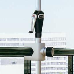 Parasol, réglable en hauteur et en inclinaison, sans socle. Extrêmement résistant aux intempéries.