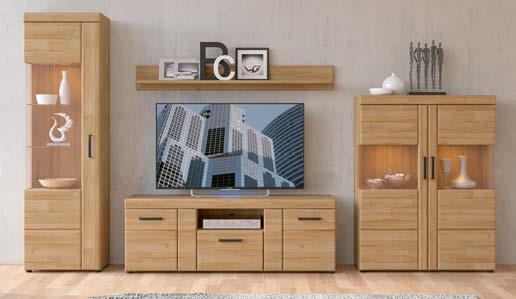 WOHNWAND, in Grandsom Eiche Dekor, Griff: Antik, mit Vollauszug, gehärtetes Rauchglas, Softclose, B/H/T: ca. 337x195x41 cm.