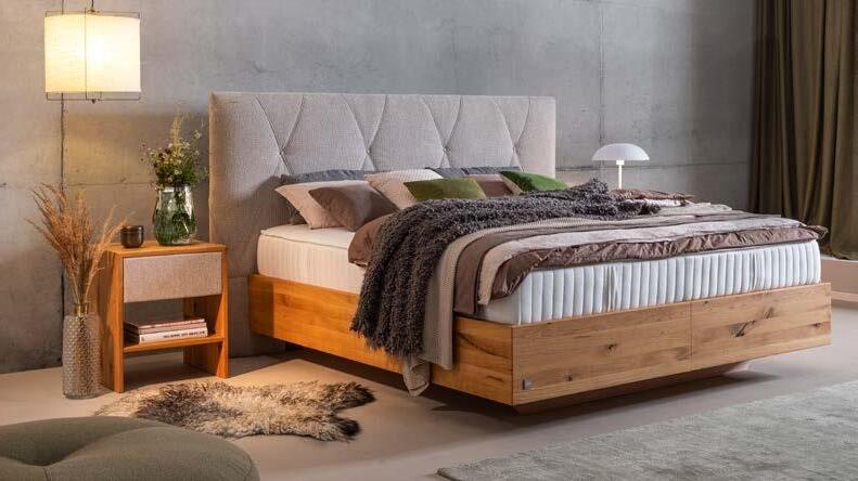 Modernes Boxspringbetten-System, das Natur und Komfort vereint. BOXSPRINGBETT in ausgestattet mit 7-Zonen Tonnentaschenfederernmatratze mit ca. 1000 Mikrotonnentasc optik mit 7-Zonen Tonnentaschenfederkern. In Liegefläche ca. 180x200 cm *statt 7.095.und Plaid gegen Mehrpreis erhältlich. Andere Größen, Stoffe, Holzarten und Zusammenst NATUR