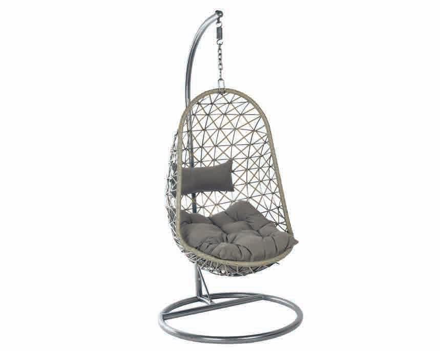 Moderner HÄNGESESSEL, mit Metallgestell, Sitzkissen und Polster, belastbar bis 120 kg, H/Ø ca. 195/95 cm.