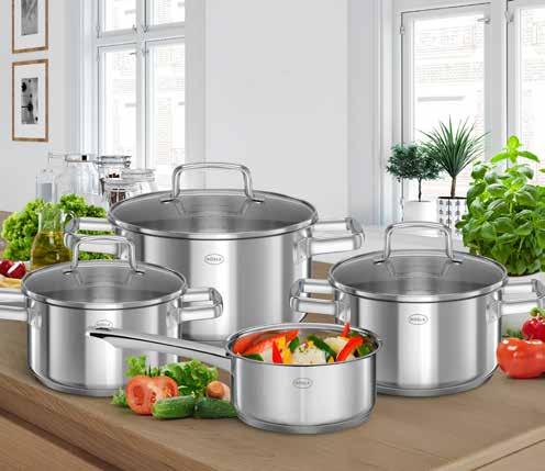 MARKENTOPFSET, 4-tlg. Edelstahl 18/10 mit Aluminiumkern, Schüttrand, für alle Herdarten geeignet, inkl. Induktion, best. aus: Kochtopf mit Glasdeckel Ø ca. 16 cm, Ø ca. 20 cm und Ø ca. 24 cm und Stielkasserolle Ø ca. 16 cm (ohne Deckel).