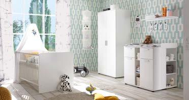 BABYZIMMER, Korpus weiß Dekor, bestehend aus: Kleiderschrank 2-trg., Wickelkommode inkl. Wickelaufsatz und Gitterbett LF ca. 70x140 cm. Unterstellregal, Standregal und Wandboard gegen Mehrpreis.