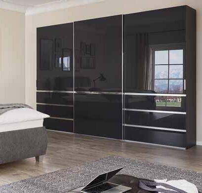 Schwebetürenschrank, Front Glas graphit, Korpus graphit Dekor, B/H/T: ca. 250x217x67 cm, ohne Schubkästen 1.199.- mit 6 Schubkästen 1.999.B/H/T: ca.300x217x67 cm, ohne Schubkästen 1.399.mit 6 Schubkästen 2.199.- Andere Größen, Farben und Ausführungen zum individuellen Preis.