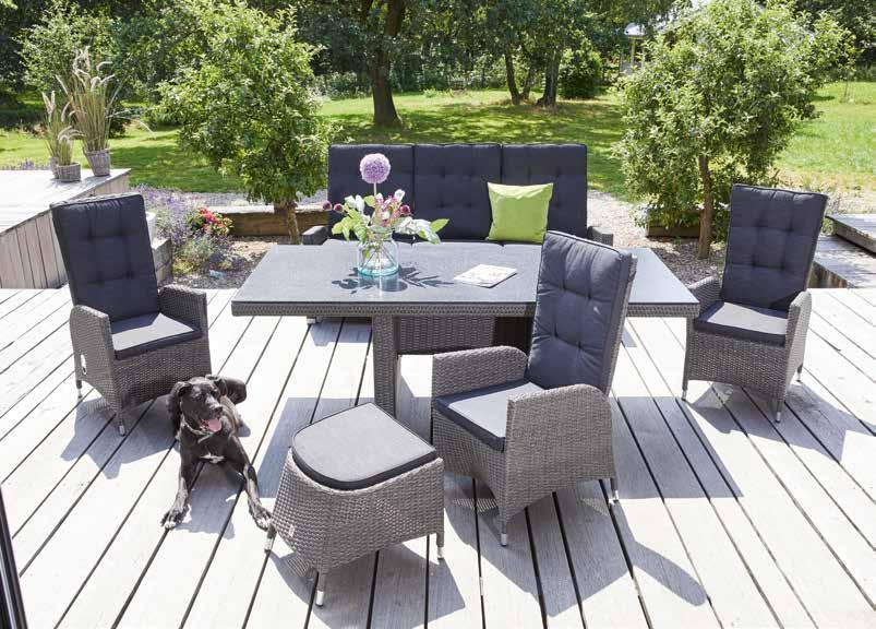 Gartenmöbelserie, Aluminiumgestell, Kunststoffgeflecht grey mix. Diningsofa, Rückenlehne verstellbar, in Speisehöhe, B/H/T: ca. 211x111x90 cm, inkl. Kissen, ohne Dekokissen *statt 1.599.- 999.- Wangentisch, Tischplatte Glas keramikbeschichtet, L/B/H: ca. 220x100x75 cm *statt 1.099.-799.- Positionsstuhl, Rückenlehne verstellbar, B/H/T: ca. 65x112x62 cm, inkl. Kissen. Hocker, B/H/T: ca. 57x44x50 cm, inkl. Kissen *statt 169.- 119.-
