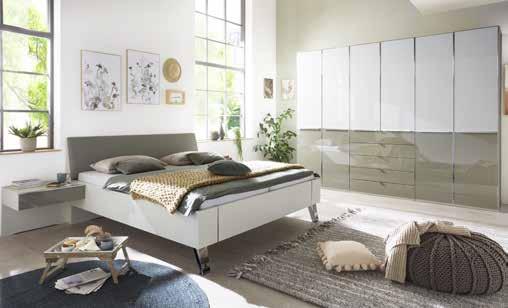 Modernes Schlafzimmer, Korpus weiß, Front Glas weiß/kieselgrau. Funktionsschrank 6-trg. mit 5 Schubkästen, B/H/T: ca. 300x236x58 cm 1.899.- 1 Paar Nachtkommoden schwebend 299.BETT, LF ca. 180x200 cm mit Polsterkopfteil. Andere Größen, Farben und Zusammenstellungen, zum individuellen Preis.