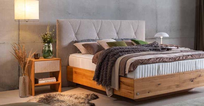 Hochwertiges BETT, LF ca. 160x200 cm, in Wildeiche massiv mit gepolstertem Kopfteil, Unterfederung und Matratze aus 7-Zonen-Tonnentaschenfederkern, Matratze wahlweise in H2, H3 oder H4 erhältlich. LF ca. 180x200 cm 4.499.Nachtkommoden, Beleuchtung, Zierkissen und Plaid gegen Mehrpreis erhältlich. Andere Zusammenstellungen zum individuellen Preis erhältlich.