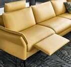 Moderne, bodenfreie WOHNLANDSCHAFT in Leder yellow, Rücken in Leder bezogen, Stellmaß: ca. 172x280 cm, Sitz mit durchgeschäumtem Federkern, wahlweise in 3 verschiedenen Sitzhärten, Alufuß in schwarz oder poliert. Sitztiefenverstellung, Liegearmlehne, motorische Beinauflage, Chaiselongue mit motorischer Verstellung, Kopfstütze oder Premiumkopfstütze, Kissen sowie andere Farben und Zusammenstellungen zum individuellen Preis erhältlich.